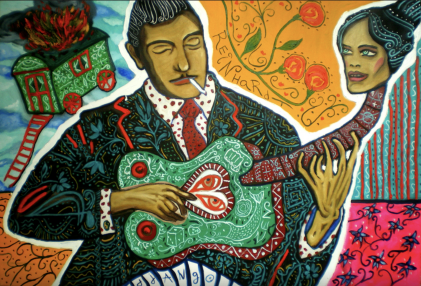 Deze balkan-expressionist zoals hij zichzelf omschrijft uit Roemenië heeft de Belgische jazzpionier van roma-origine, Django Reinhardt, geboren in Liberchies bij Charleroi, treffend geportretteerd. Django verloor het gevoel in enkele van zijn vingers bij een brand in zijn woonwagen en creëerde daarom een heel specifieke gitaartechniek die vandaag de dag nog steeds door jazzgitaristen wordt gespeeld. Vingervlug en prachtig virtuoos was zijn spel waarmee hij Wereldoorlog II in Parijs overleefde, als Rom geen sinecure aangezien zijn volk massaal werd gedeporteerd naar de concentratiekampen. Hij stond aan de wieg van de Hot Club de Paris, die ook in Gent met de Hot Club de Gand een kleiner broertje kent, waar nog wekelijks Django-gerelateerde muziek live wordt gebracht, o.a. door de De Cauterfamilie die zich dit genre eigen maakten met de Piotto's in de Lima van Sint-Martens-Latem. Django kwam helaas vroeg te sterven, reeds op 43-jarige leeftijd, in 1953 in Samois-sur-Seine. Jaarlijks vinden in zijn geboortedorp Liberchies en aan zijn laatste rustplaats bij Parijs Djangofestivals plaats waar gelukkig ook nog heel wat mensen van Roma-origine op afkomen om de grootste muzikant uit hun midden te eren. Check zeker op youtube enkele filmpjes van Jimmy Rosenberg, een Nederlandse reïncarnatie van Django, hij en zijn cultuur blijven gelukkig voortleven.